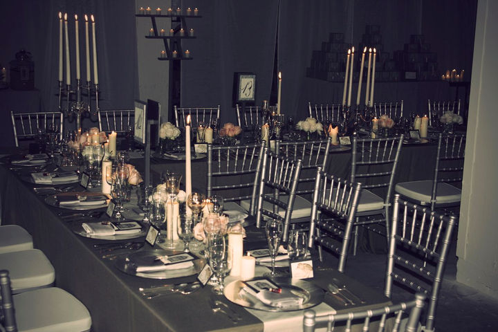 Decor Highlights- A continuous "U" shaped table arrangement encircled the dance floor and was set to accommodate a 5-course meal. The evening ceremony and reception was lit with 500+ candles in a series of vintage candelabras, chandeliers, birdcages and tiered towers. A candy bar was created with a series of apothecary jars in a salvaged vintage cabinet. Ten cakes, of various flavors, were created in a monochromatic color scheme and decorated with fresh floral.